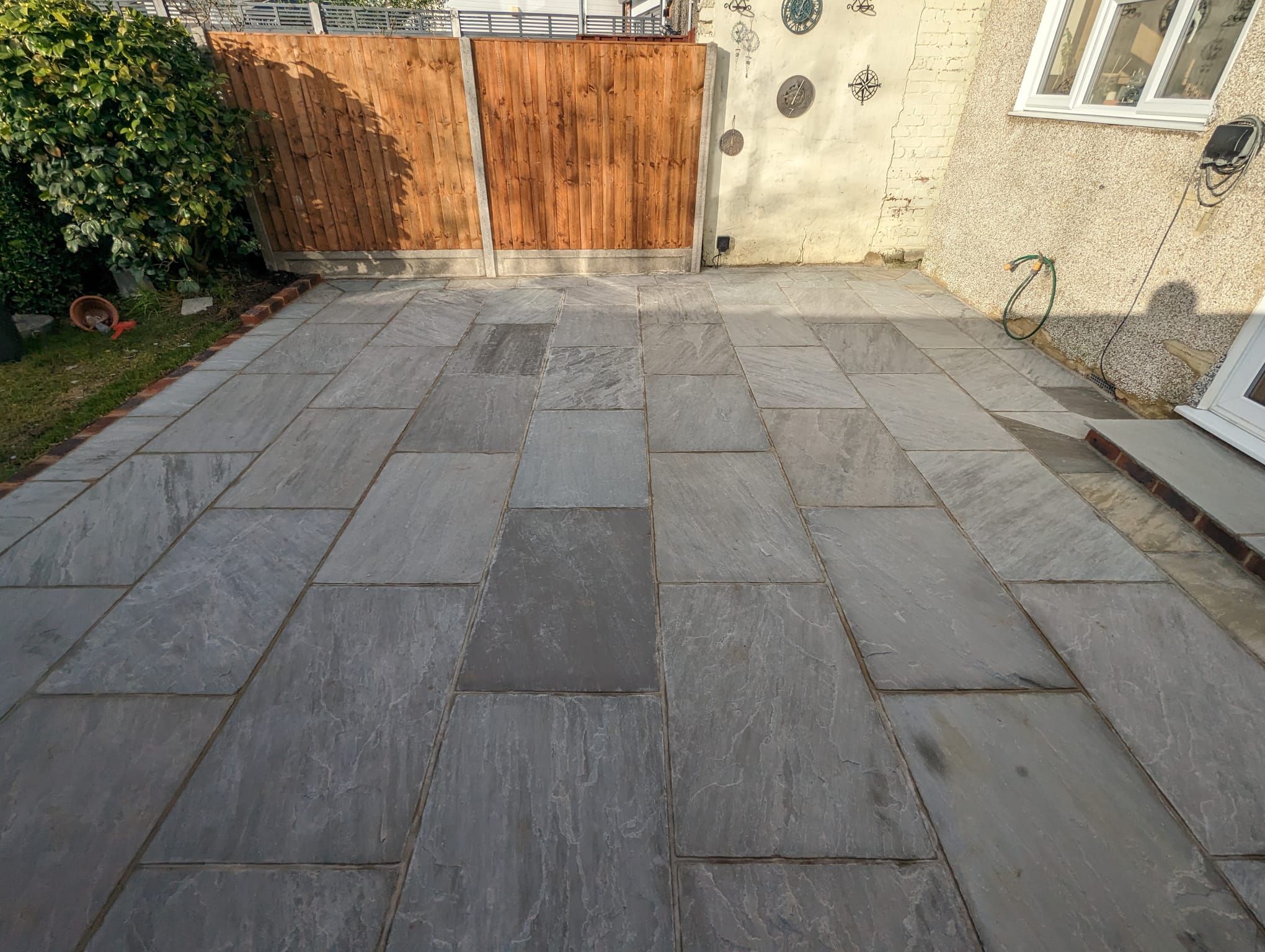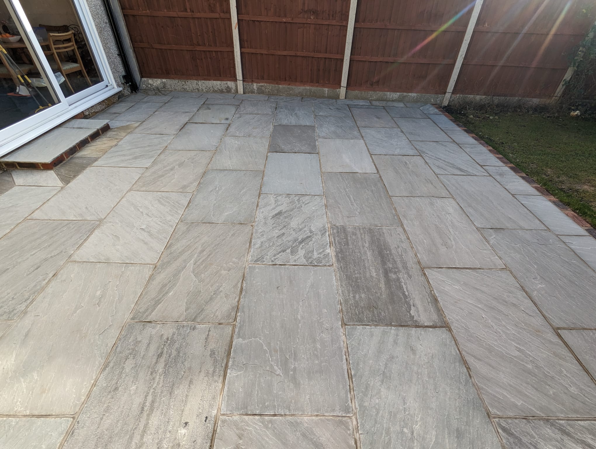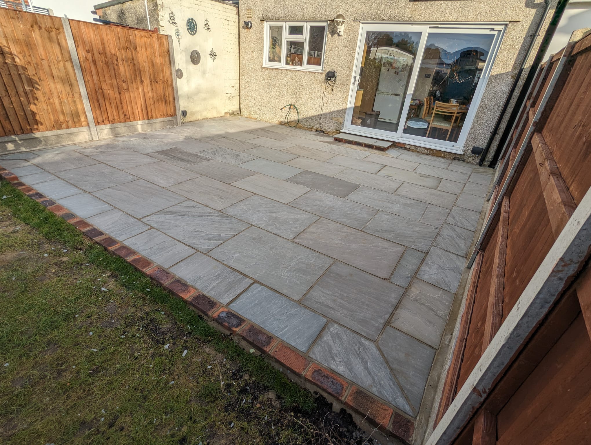 We used all sub base materials and concrete and once we removed the concrete and began to lay the sub base materials we suggested laying slabs on the perimeter of the patio so this would give a much nicer look to it. This would mean the slabs cut into the edge of the slabs than into the fence.