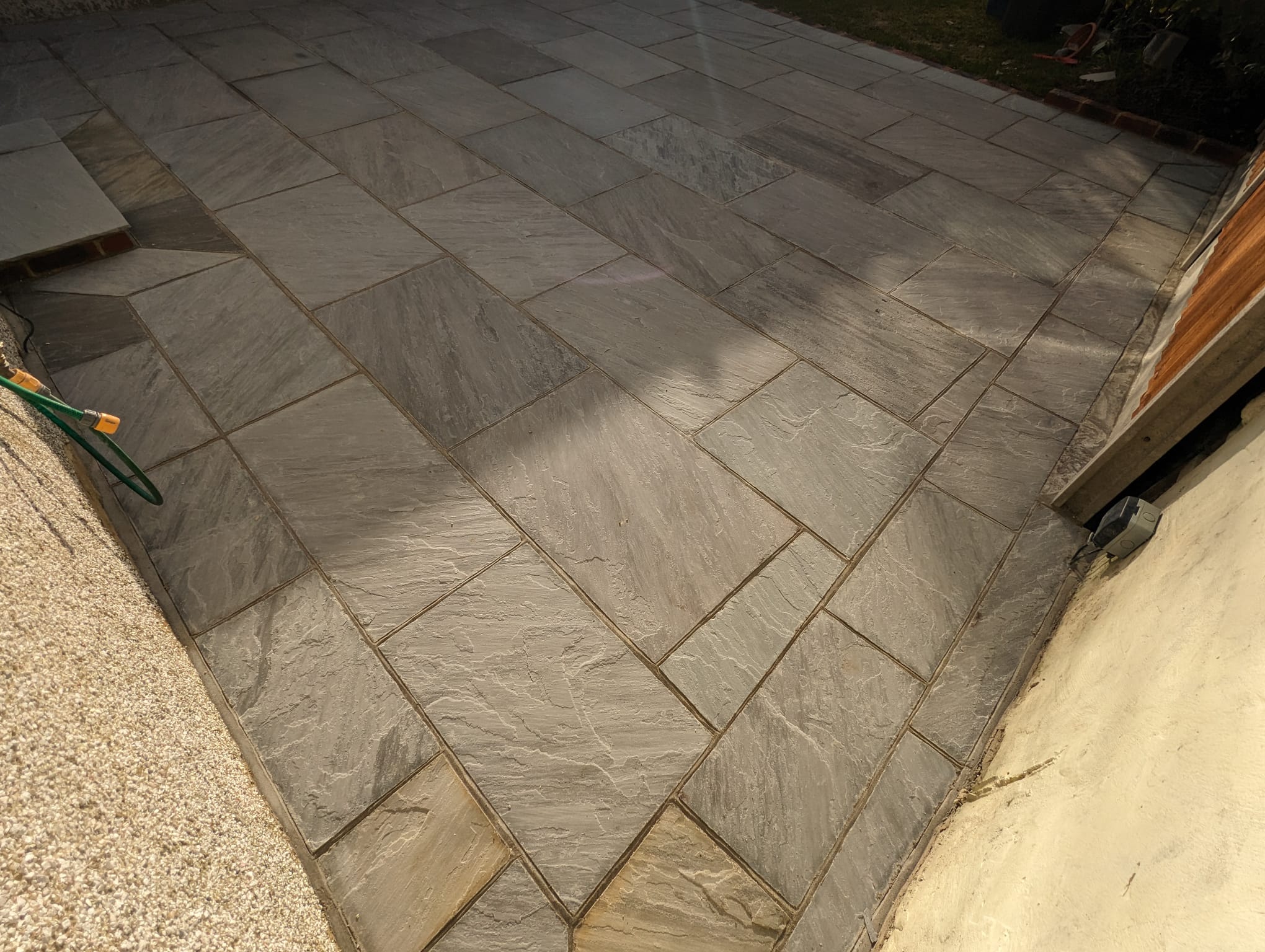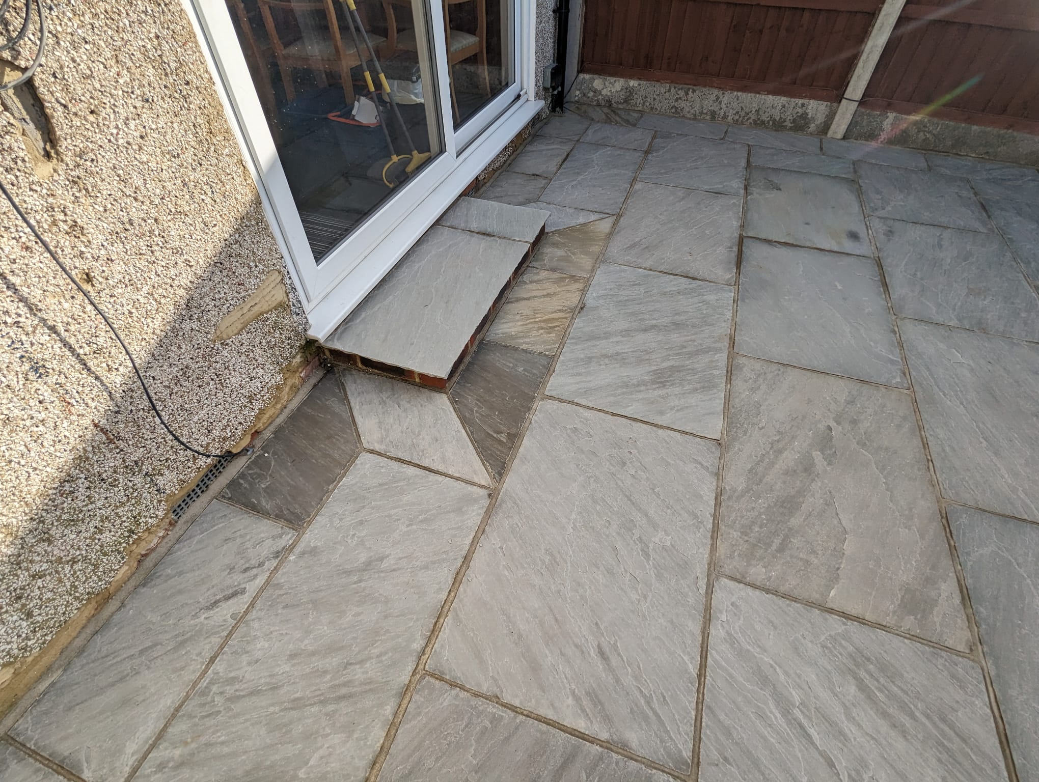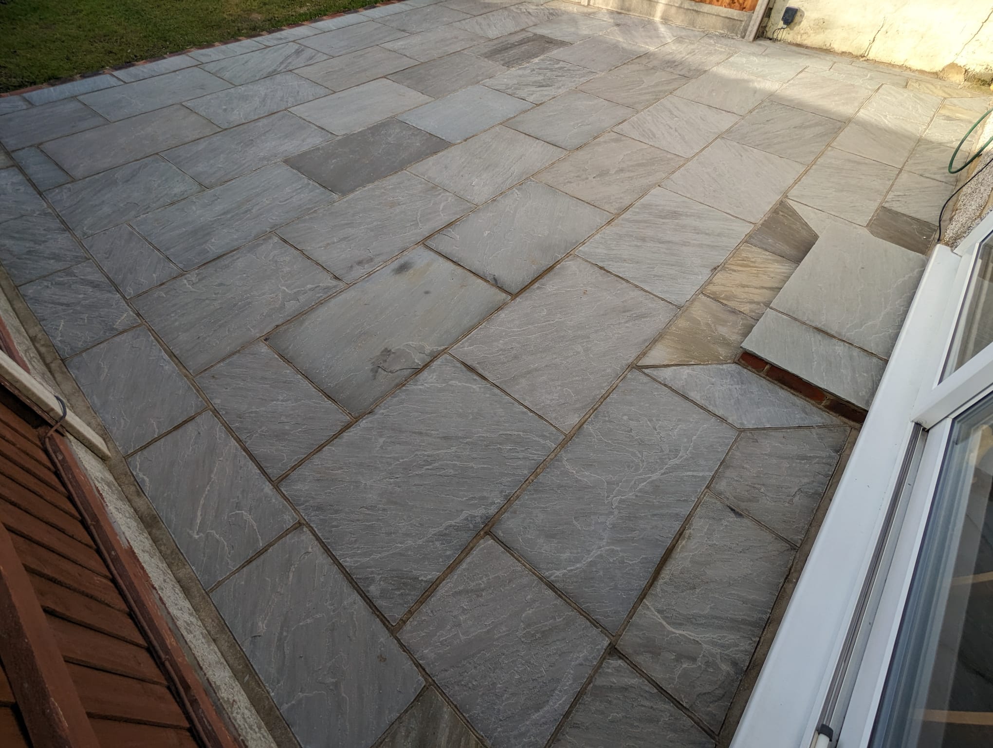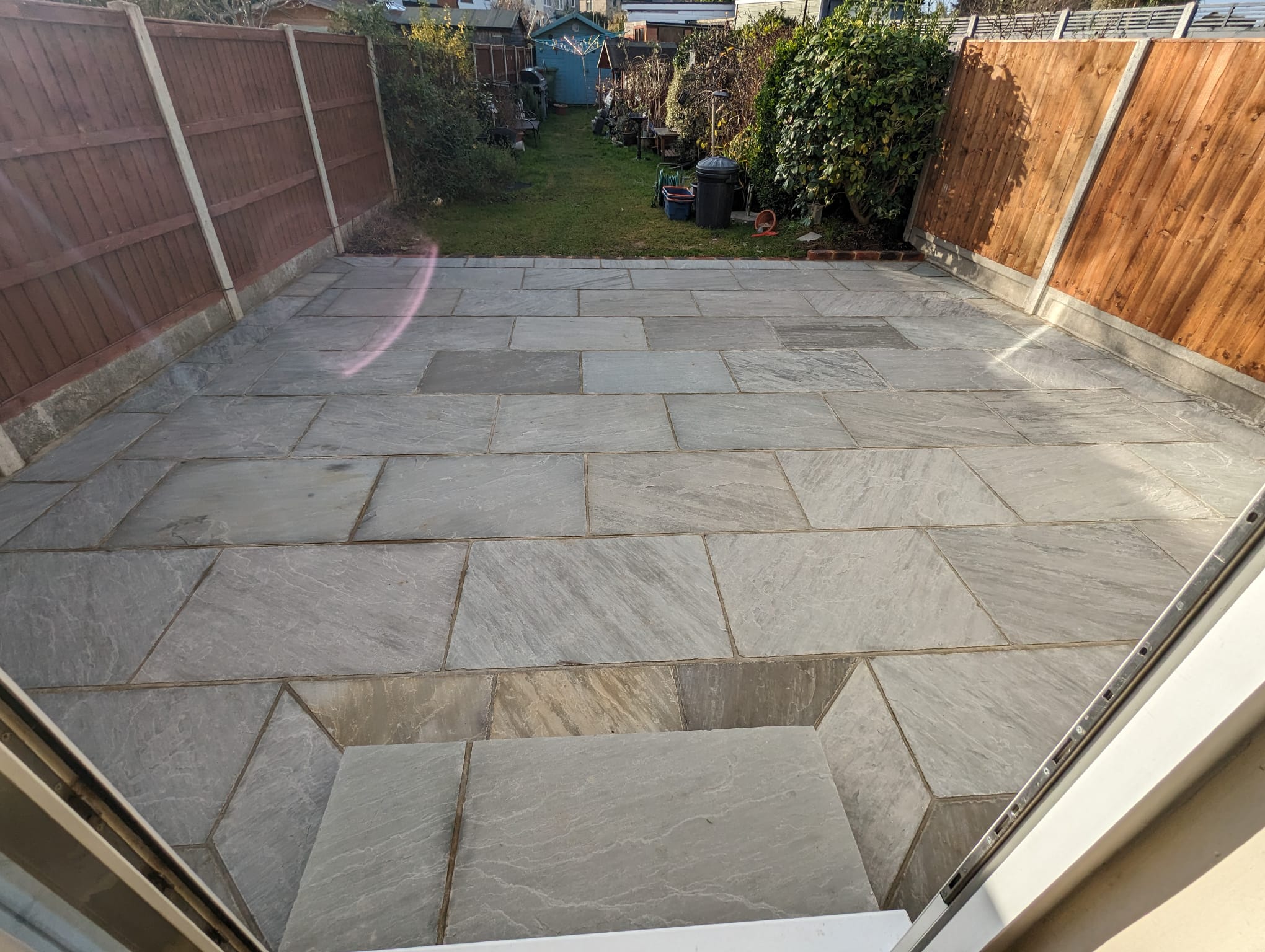 We used all sub base materials and concrete and once we removed the concrete and began to lay the sub base materials we suggested laying slabs on the perimeter of the patio so this would give a much nicer look to it. This would mean the slabs cut into the edge of the slabs than into the fence.