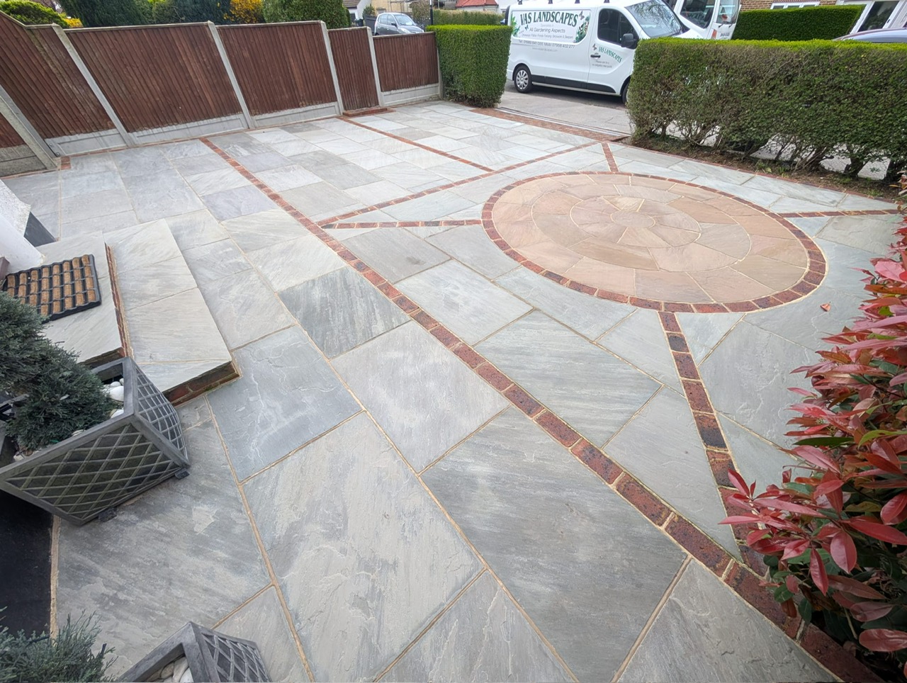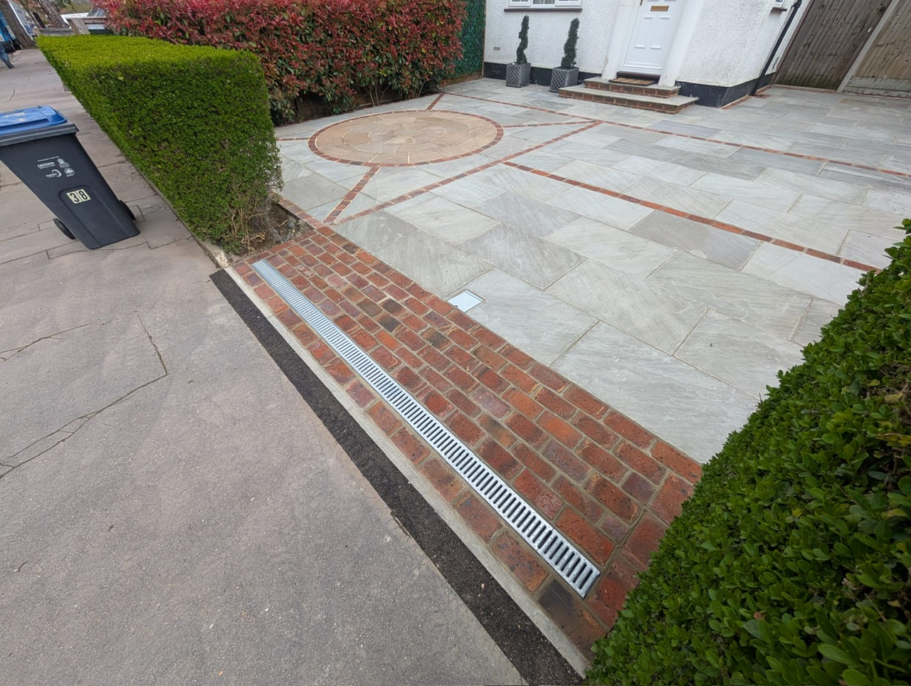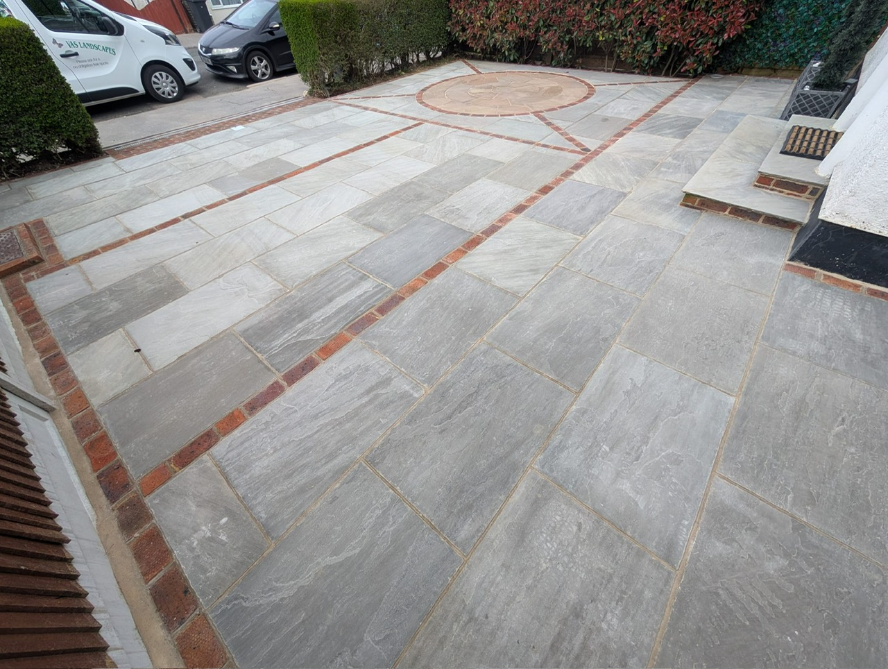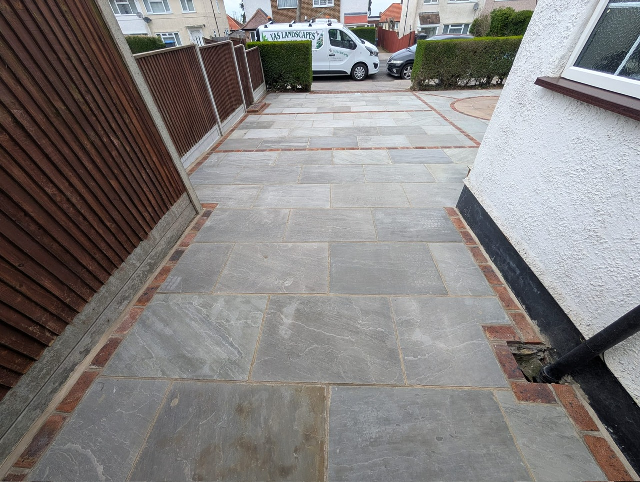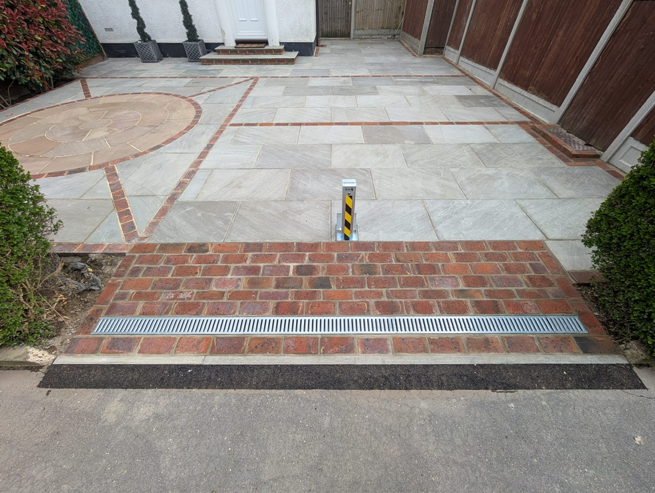 Earlier this year, after finishing several client projects, we continued work on the front driveway transformation. The remaining area was paved using Natural Indian Sandstone (Kandla Grey) laid in a coursed pattern, creating a clean, modern finish. To enhance the overall design, we incorporated brick detailing, adding contrast and character to the driveway.