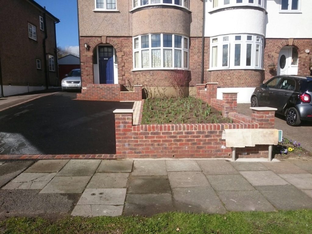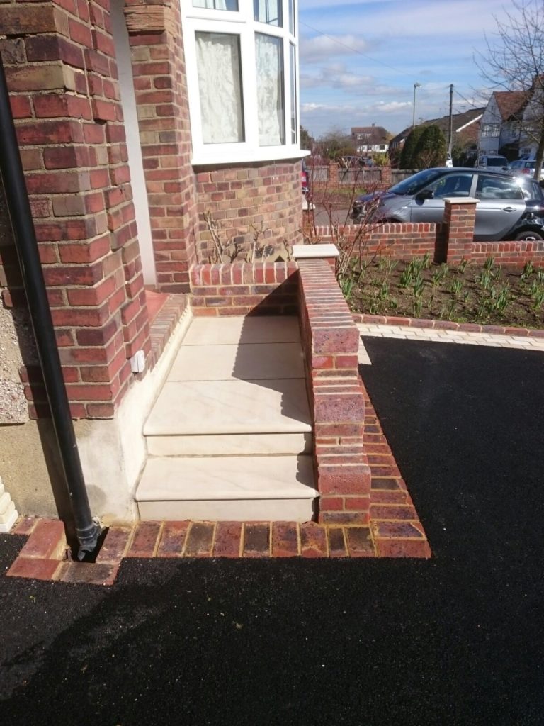 We installed new foundations and extended the opening of the driveway to allow for more vehicles. Vas Landscapes built a new 9 inch brickwork with 13 inch pillars. The door steps were facing towards the road and we built new footings to build a retaining wall and a seating area.