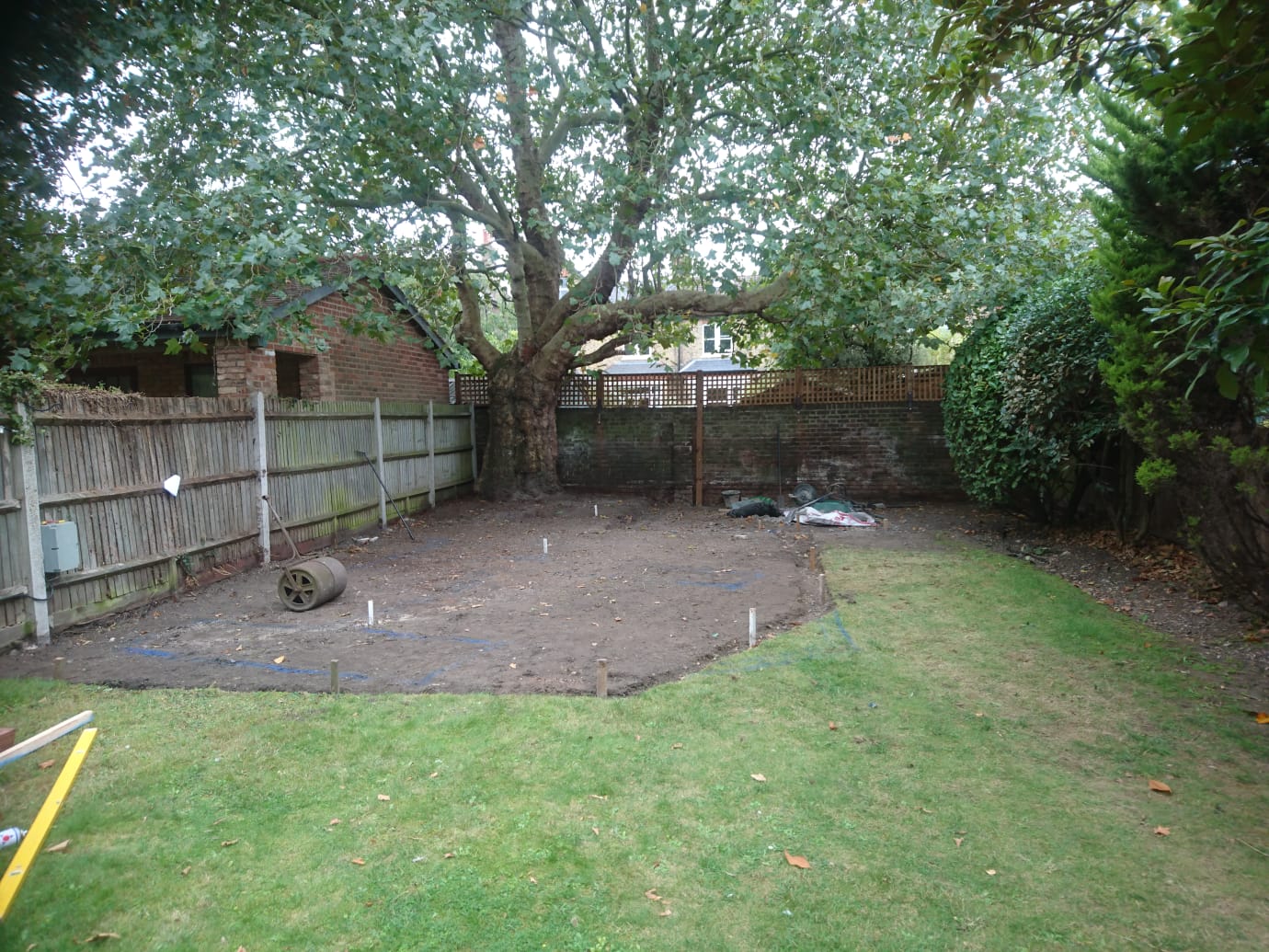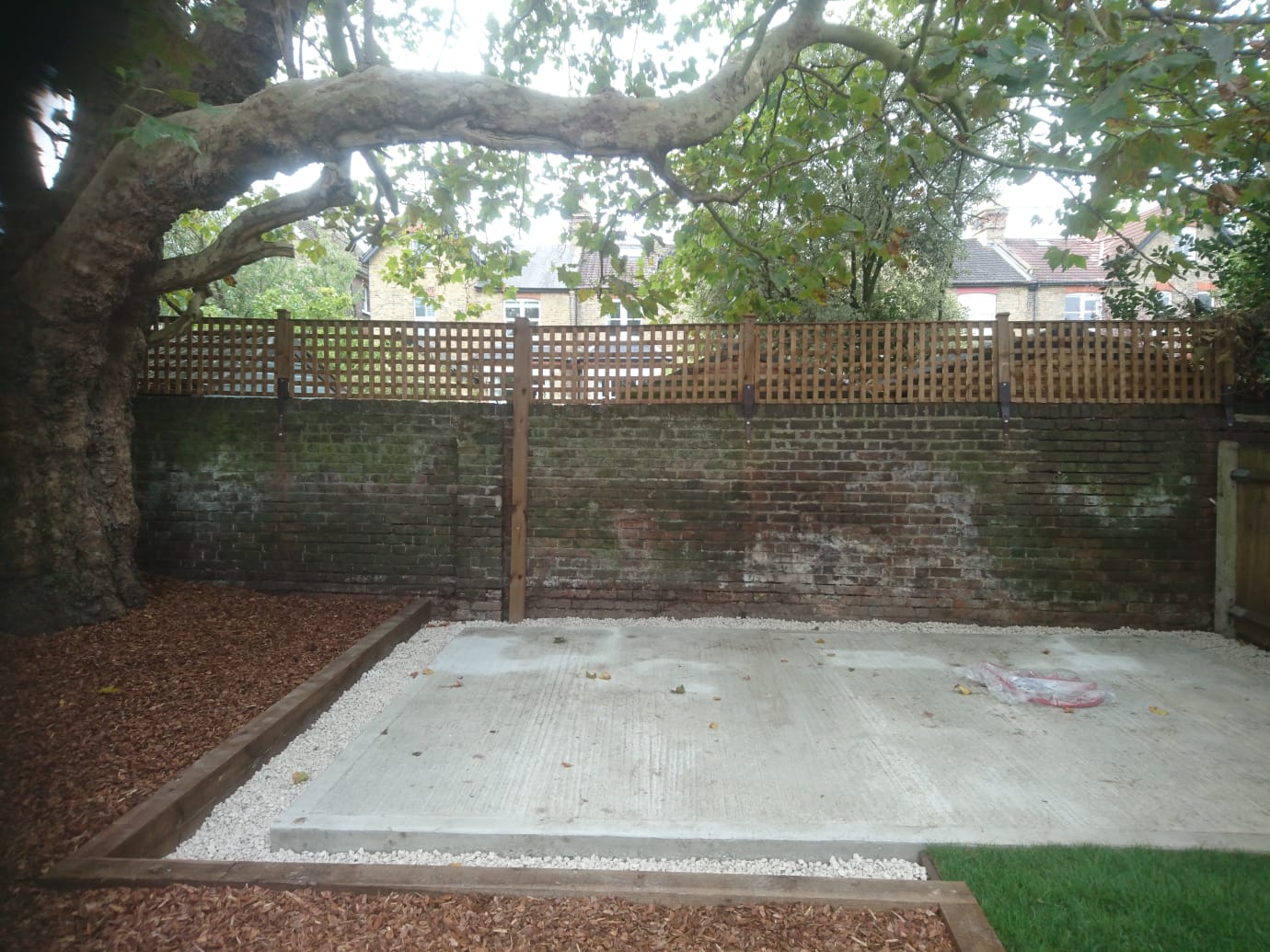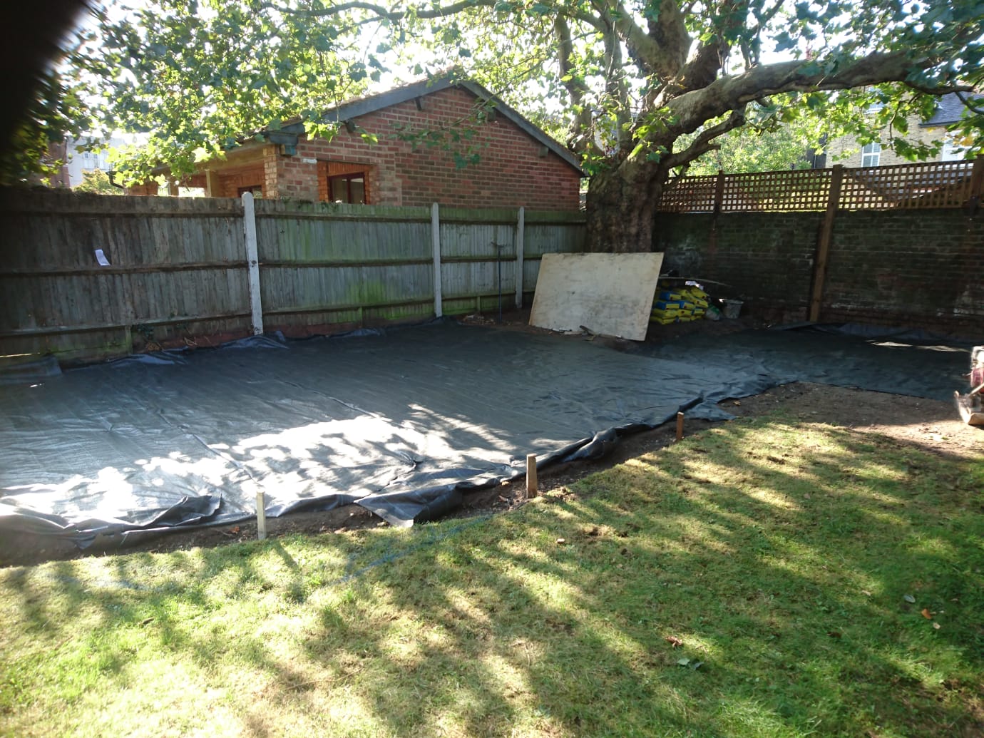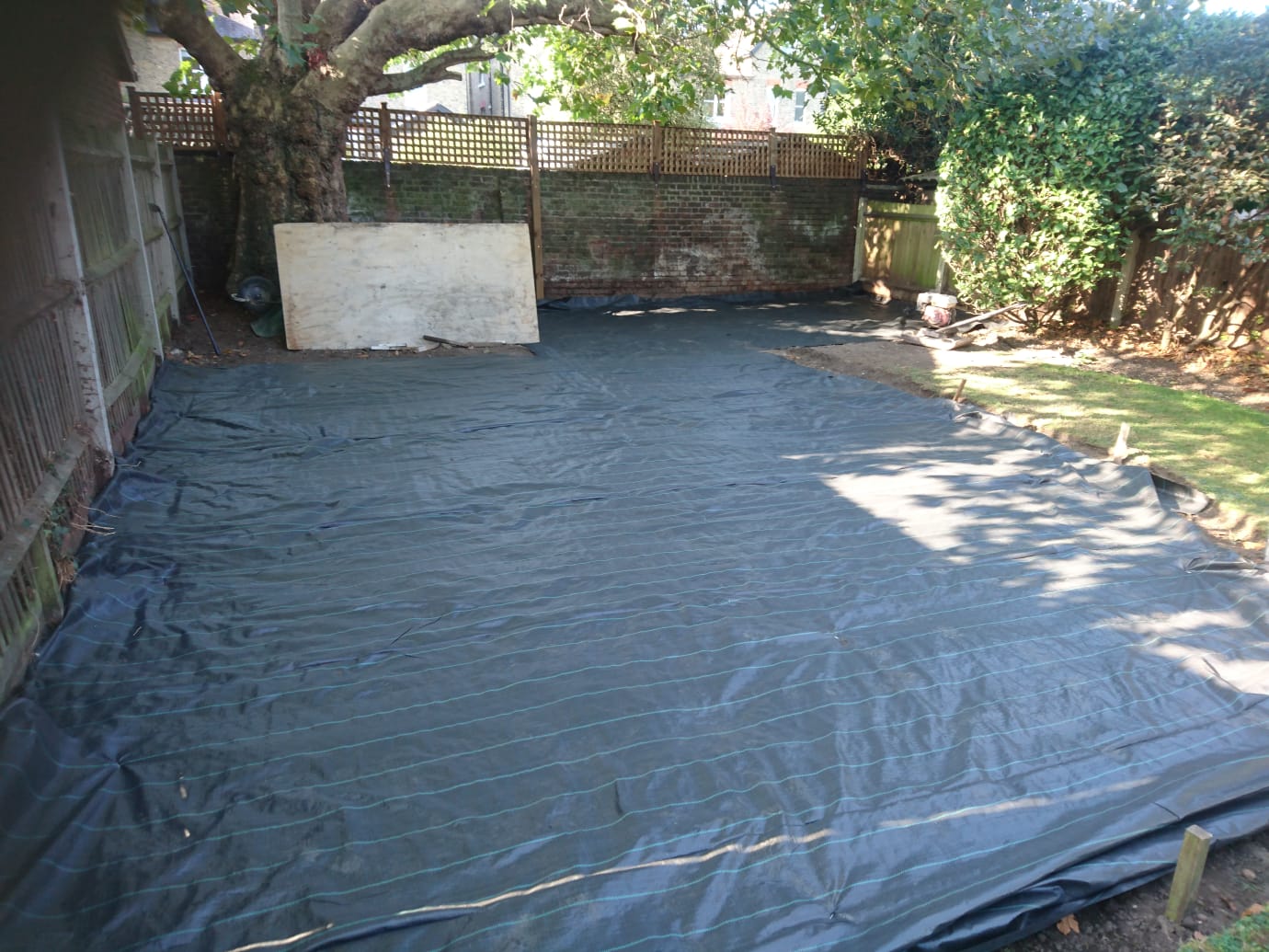 The shed base was too high and once the area was cleared I excavated the whole area at approx 88 square metres at 150mil deep. Some areas were deeper, especially around the shed area. When the ground was cleared I began to install a privacy Trellis across the rear wall which backed onto other gardens.