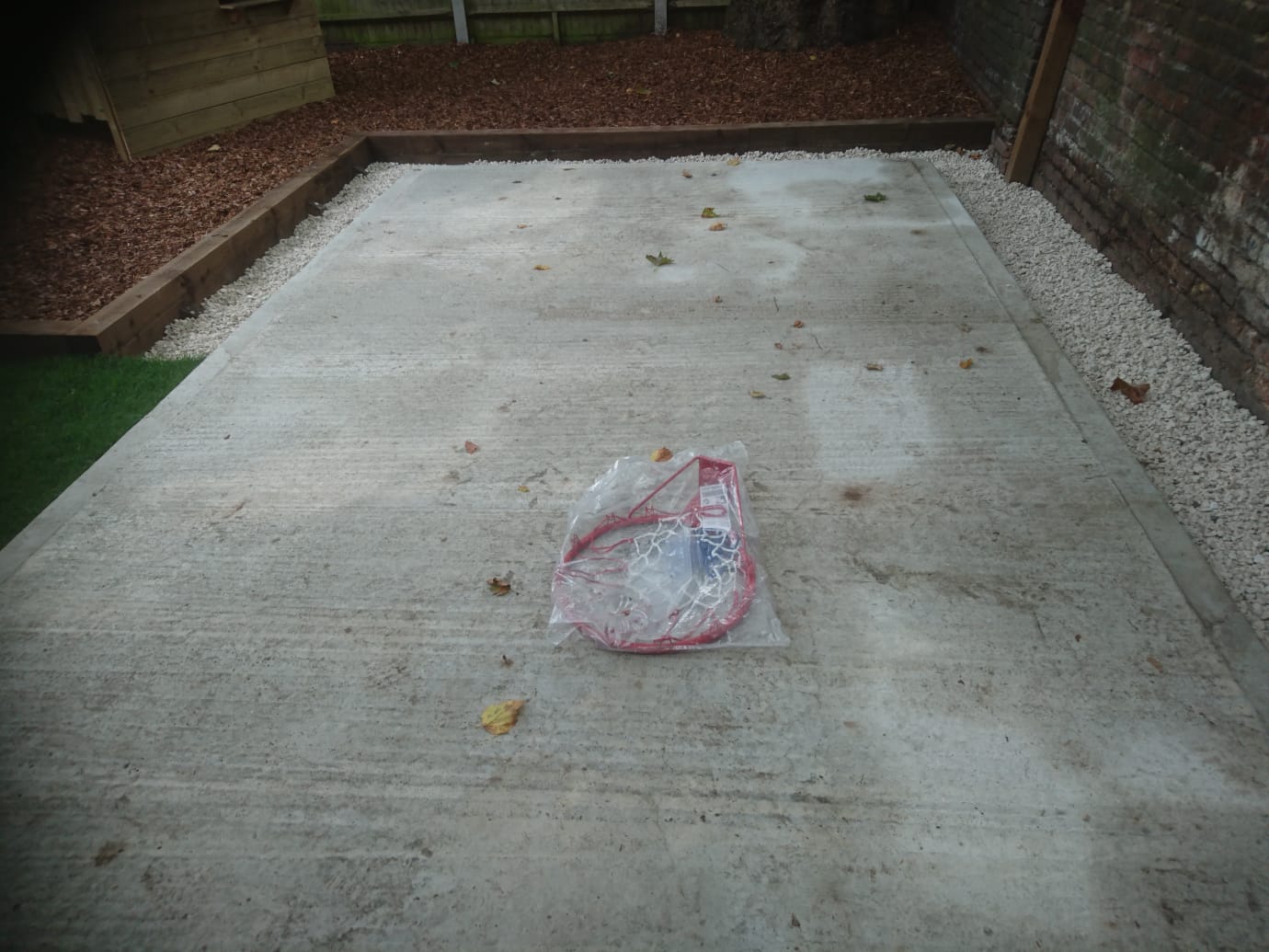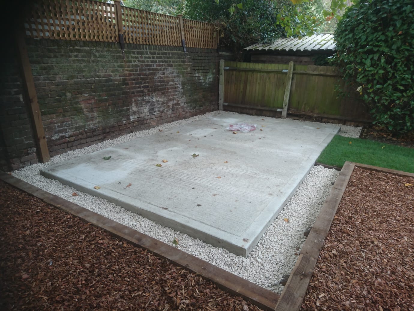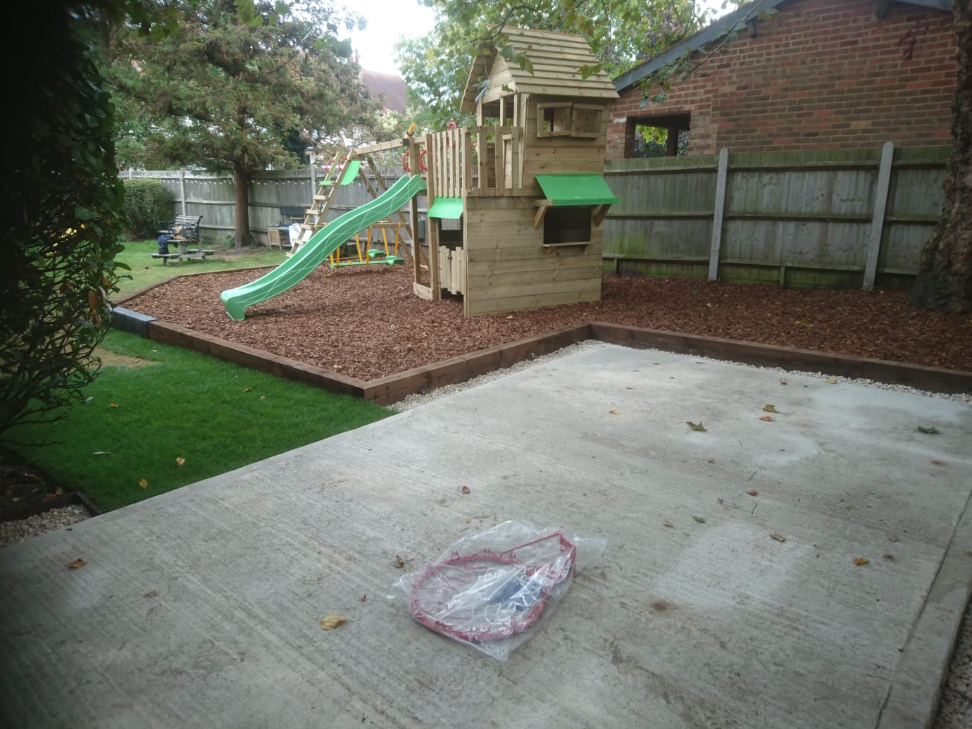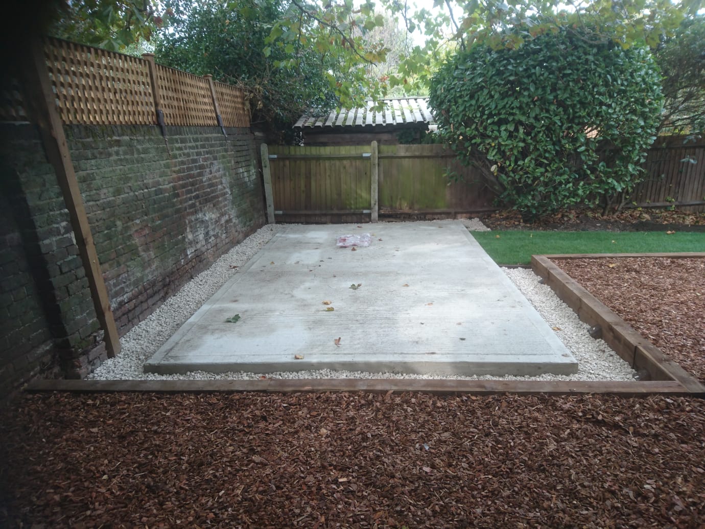 I then installed a permeable membrane over the completed area and placed a new concrete shed base with re-inforcing mesh to secure it. Once the shed base was installed I placed railway sleepers and the customer installed the children’s play apparatus on top of the membrane. I then covered the area with 11 bulk bags of play bark around and under the apparatus where required.