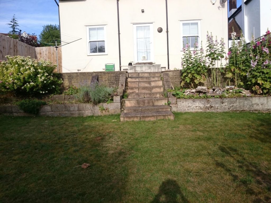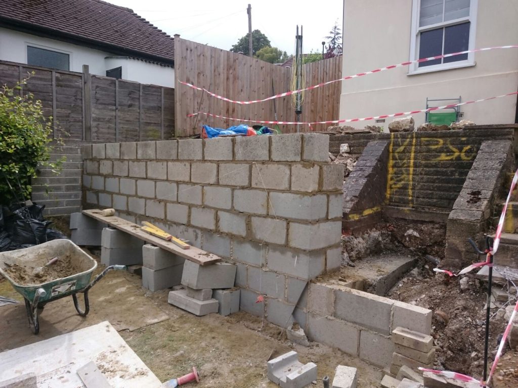 We removed the existing small lower terraced wall on the garden level and excavated new concrete footings and then installed a new concrete wall using H Blocks and re inforcing bars filled with concrete.