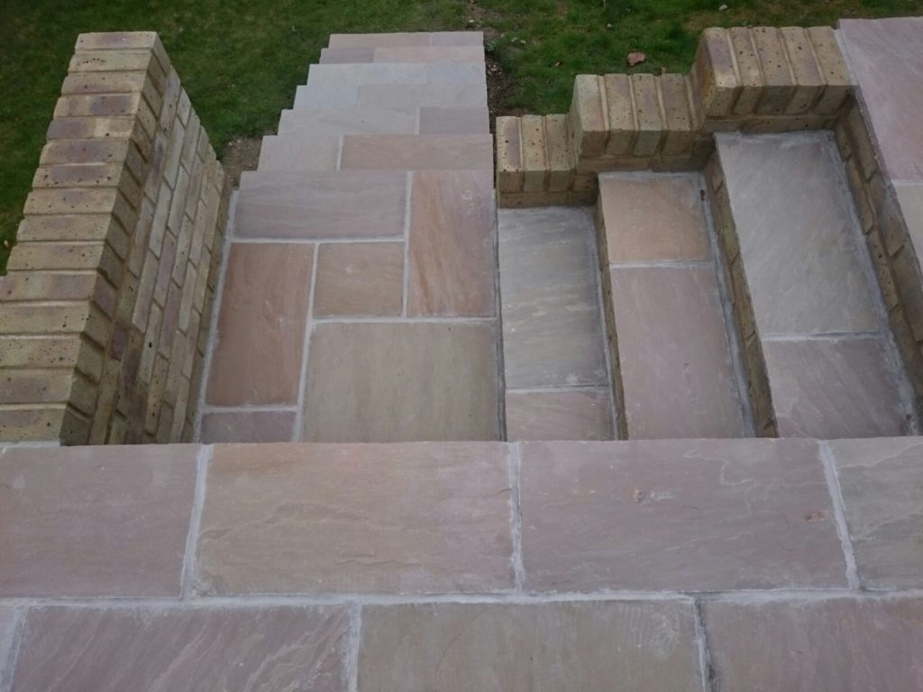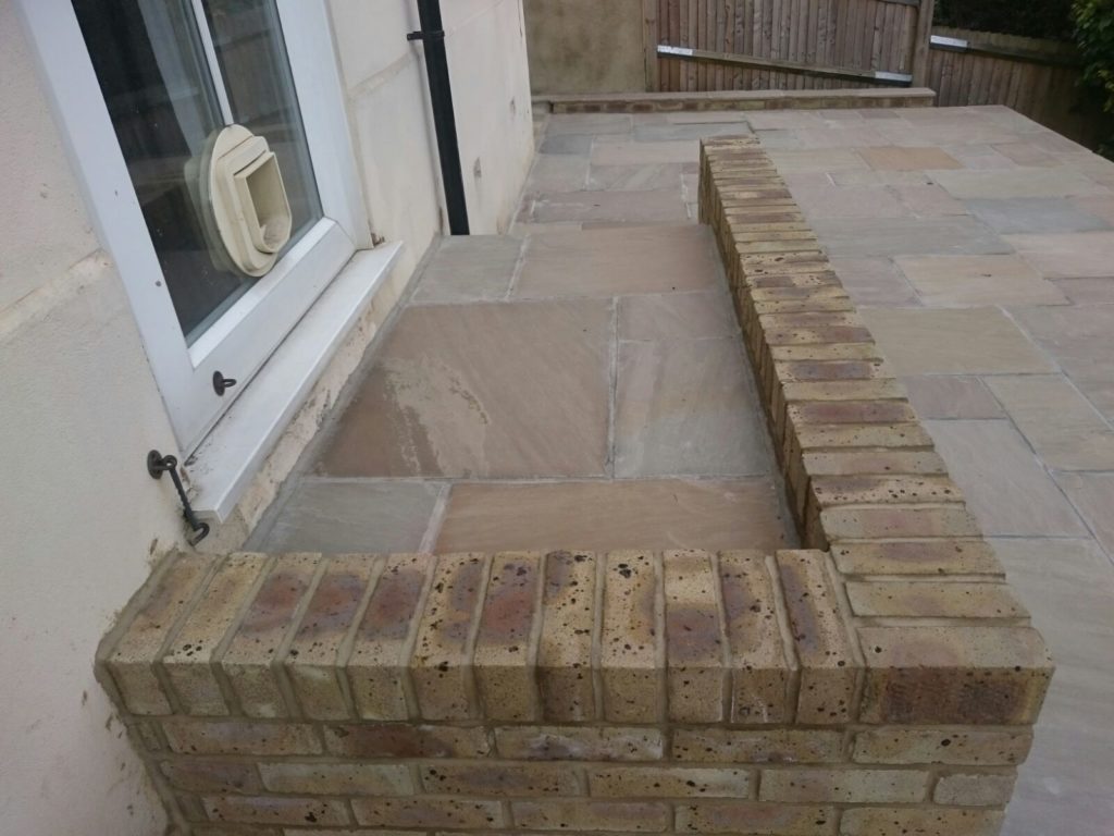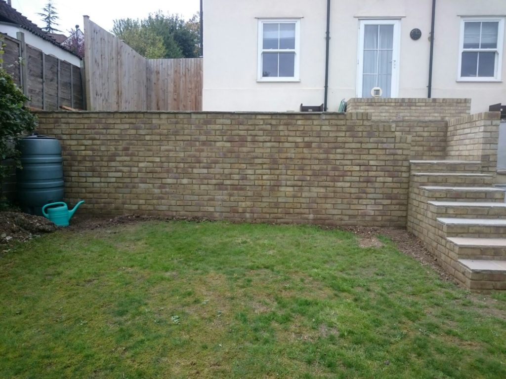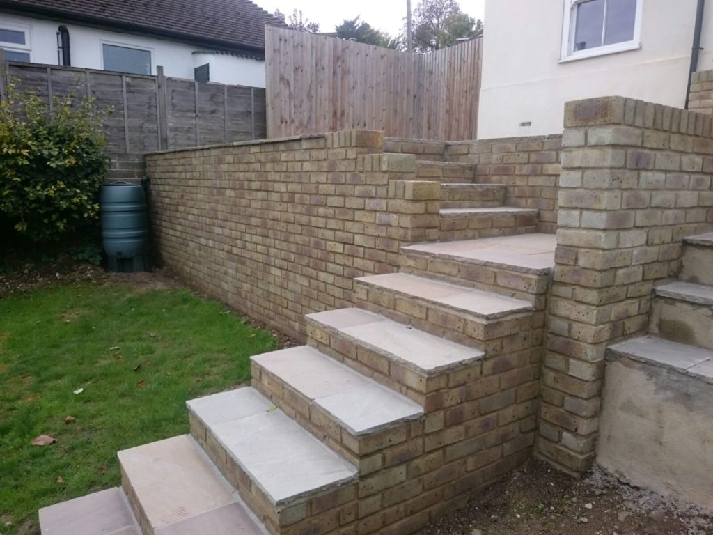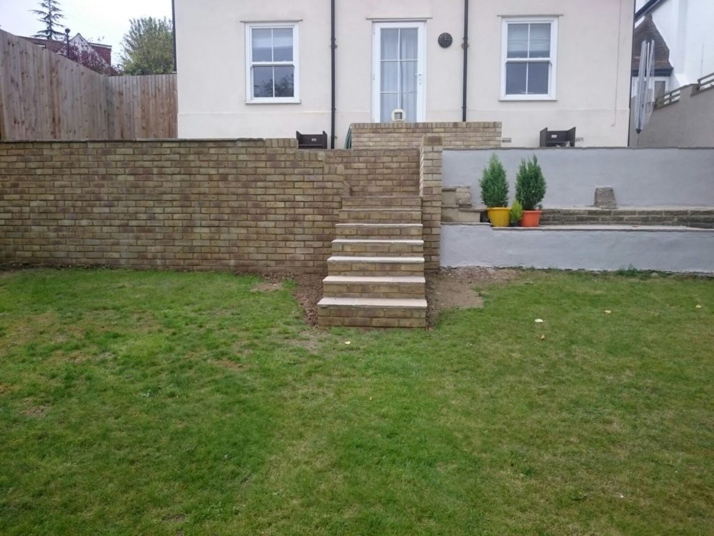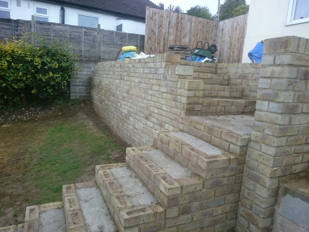 We bricked up a wall in front of the concrete blocks using a Hampstead yellow brick. We then re shaped the steps which required measuring, planning and scaling off on paperwork to make the steps work and the height of the patio.