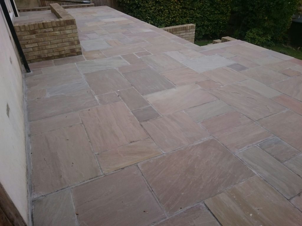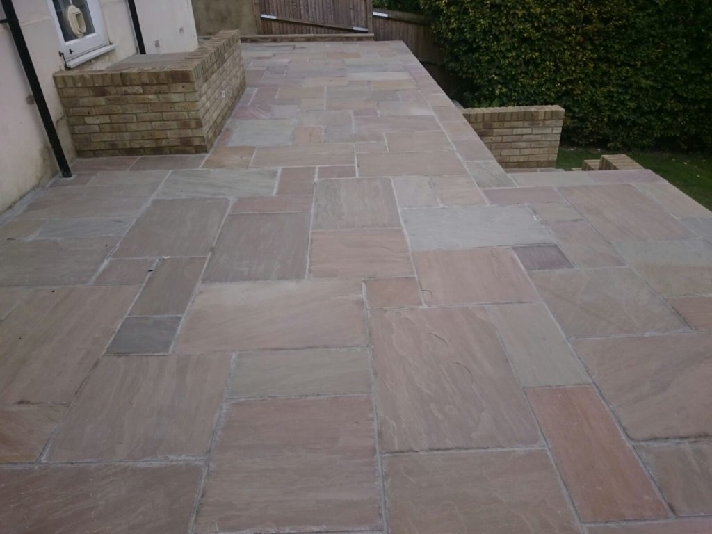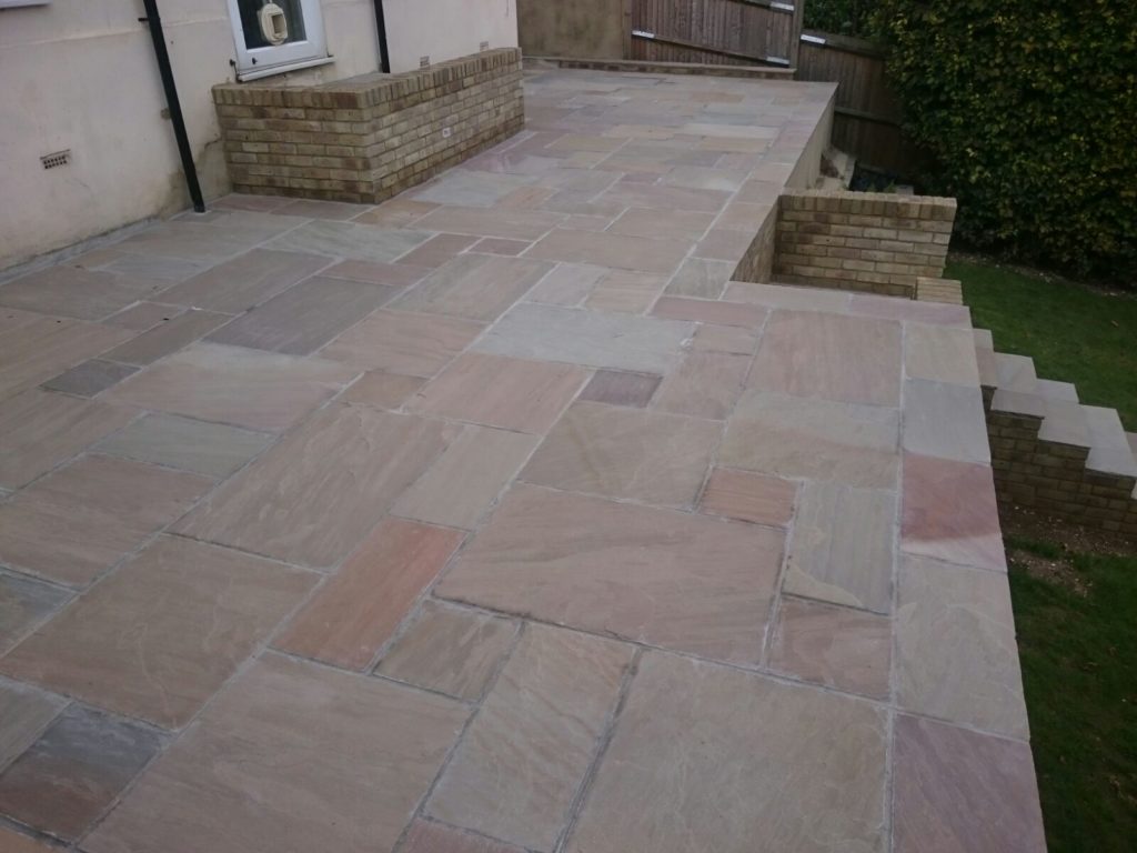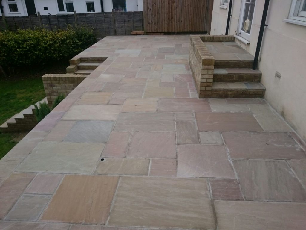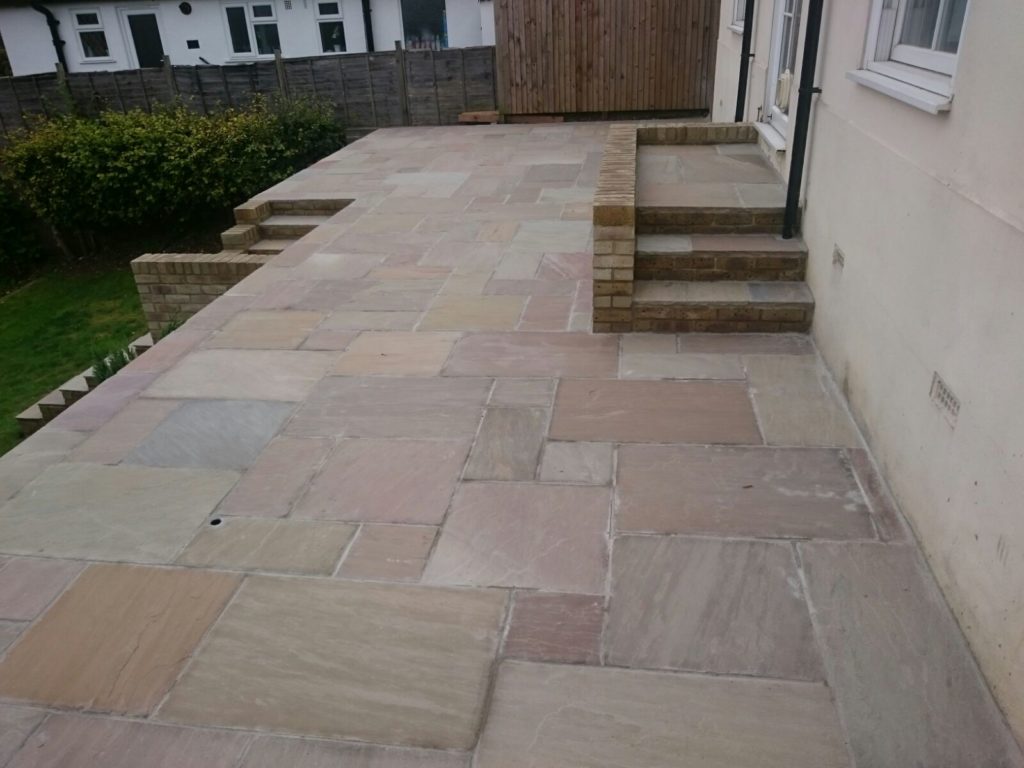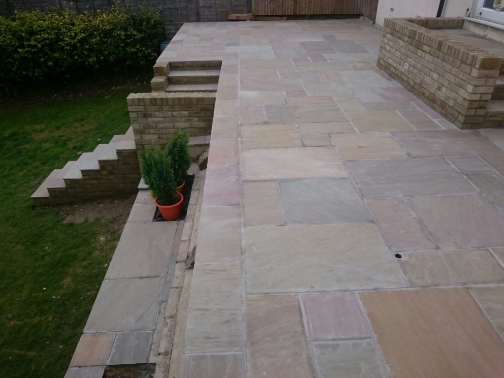 Vas Landscapes removed the uneven existing patio and then once theĀ patio was removed we built a new patio using Raj Green paving.