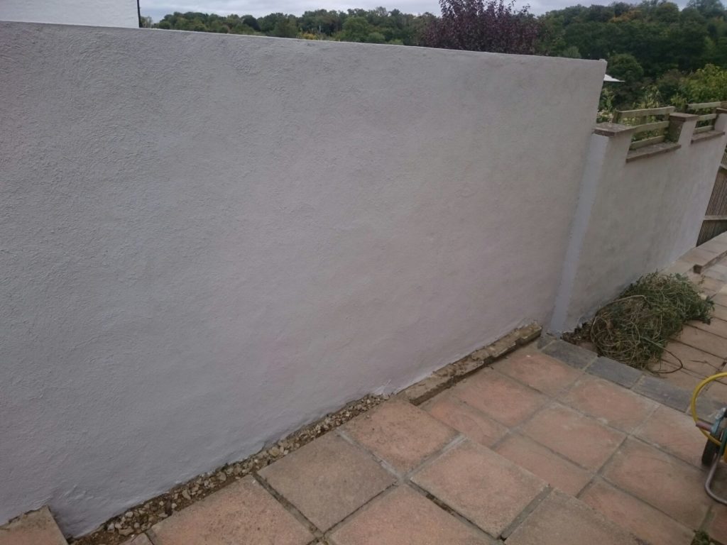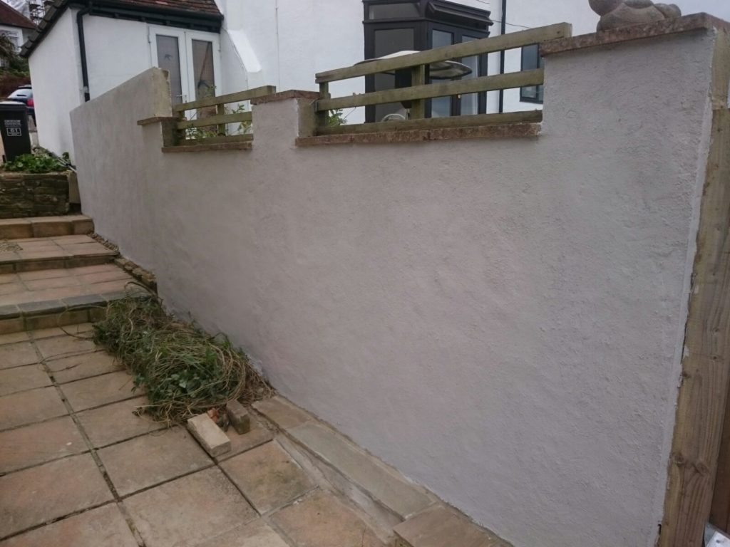 The opposite side of the steps, we built a small retaining concrete wall using H Blocks and then rendered. The existing lower wall was cleaned up and also rendered. Once the wall was completed from the rear door we built up a small wall to walk down some steps onto the patio.