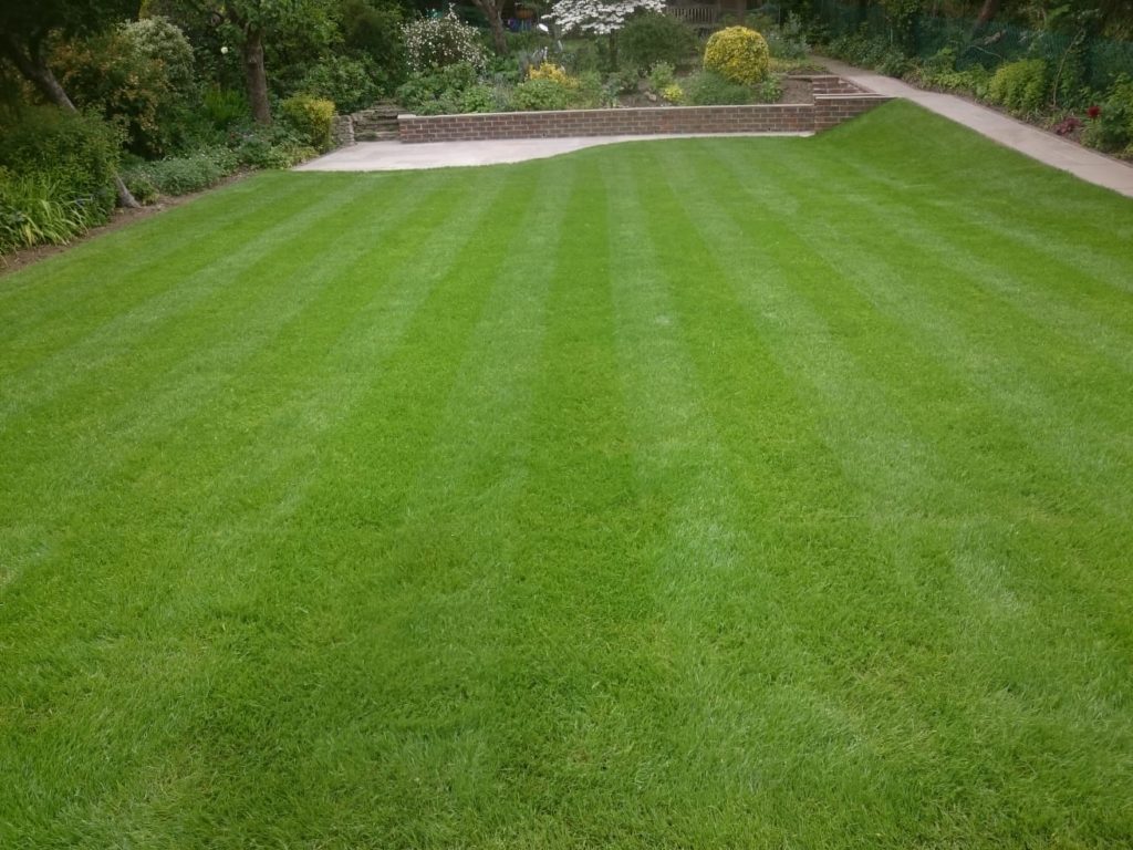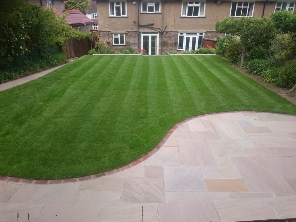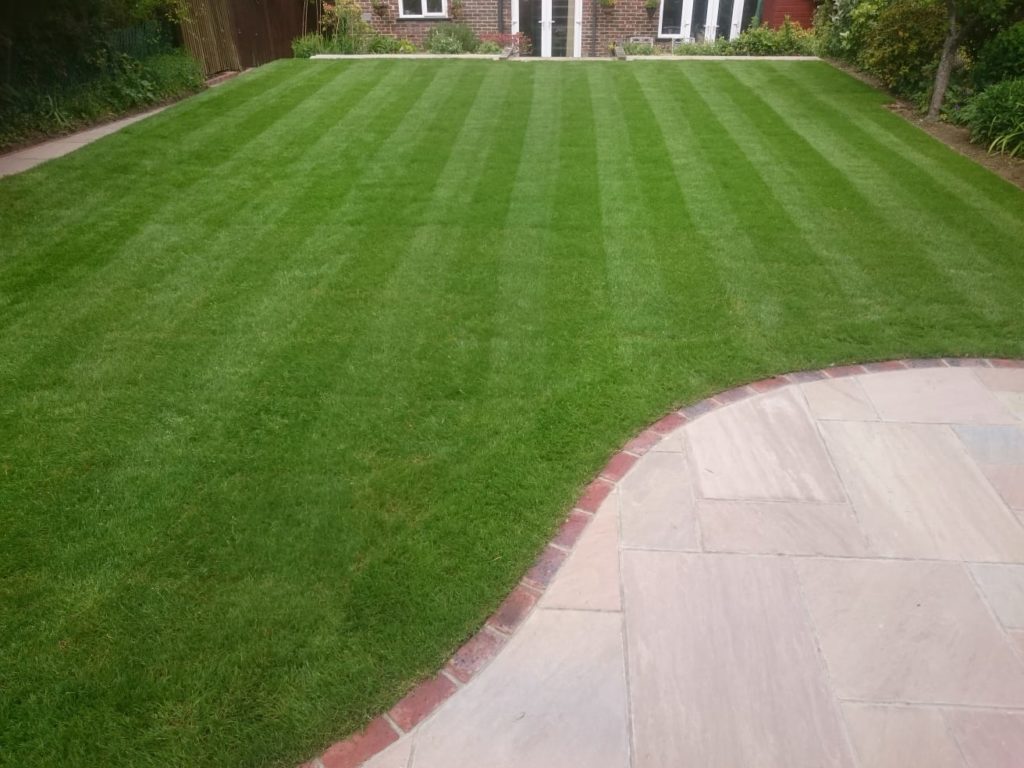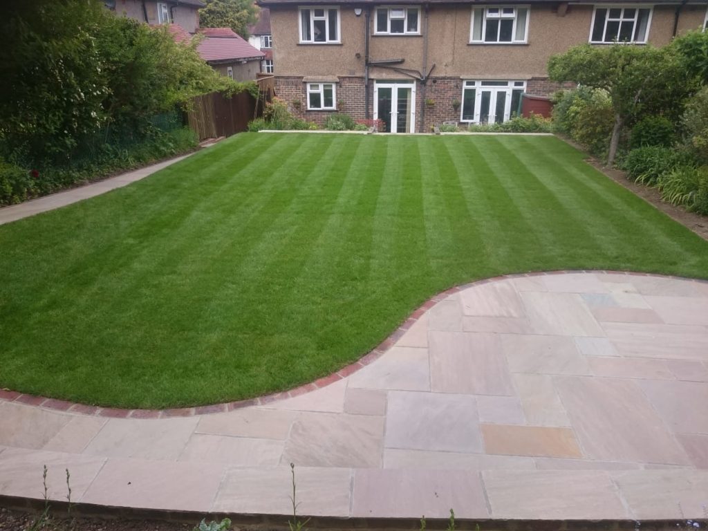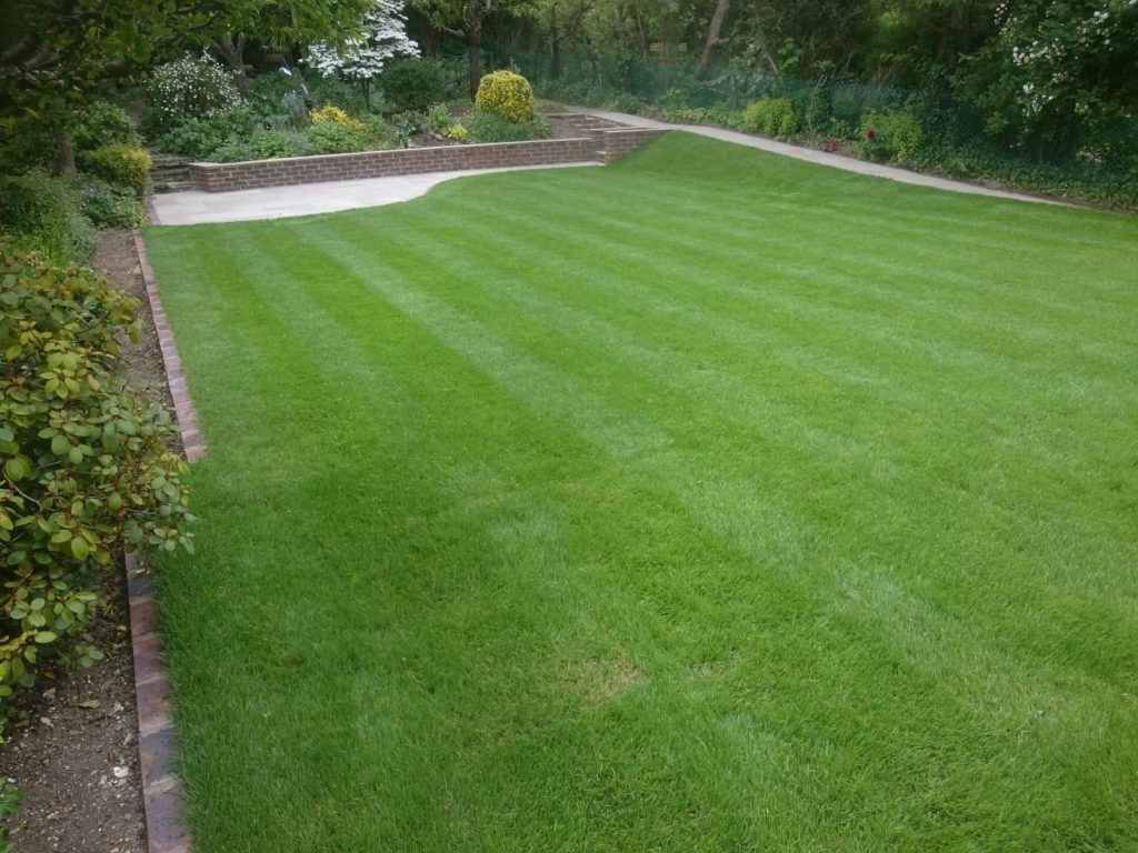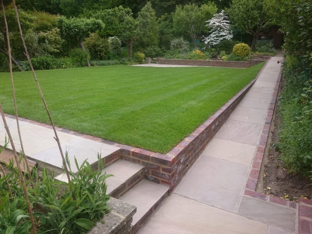 The existing lawn was removed, rotivated and leveled with topsoil brought in to make up the levels. A turf was laid using Rolawn.