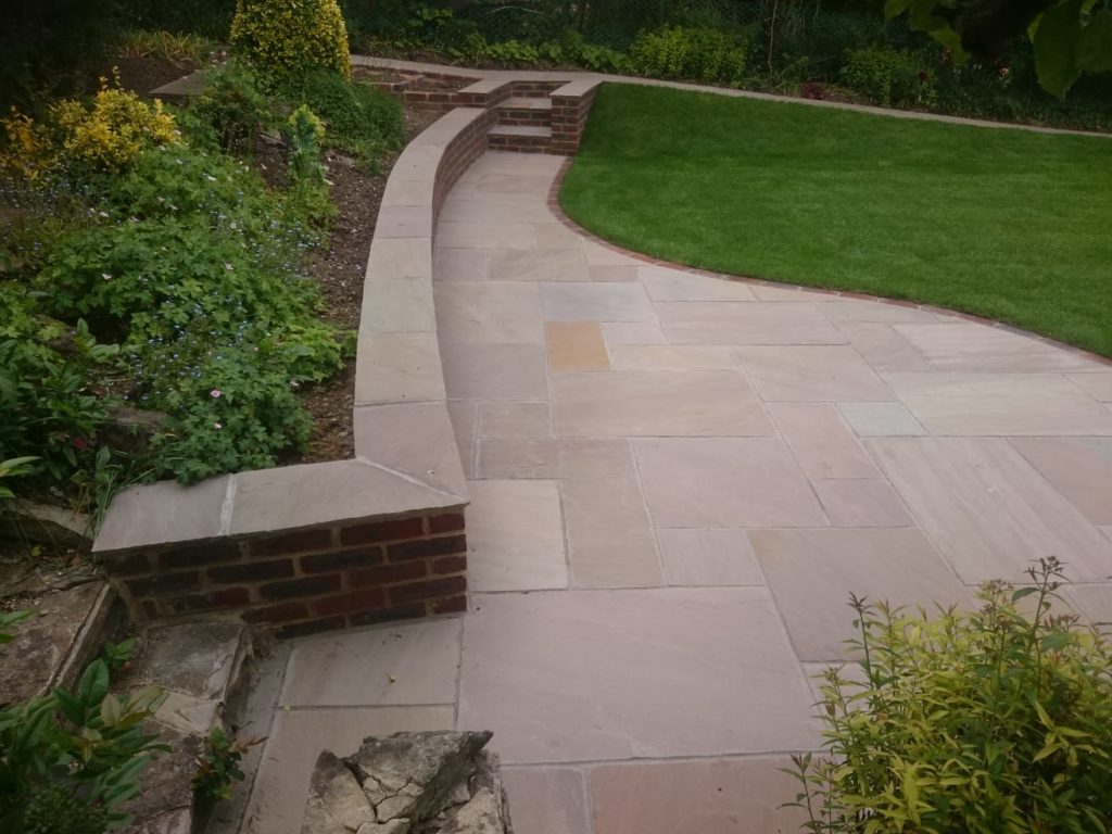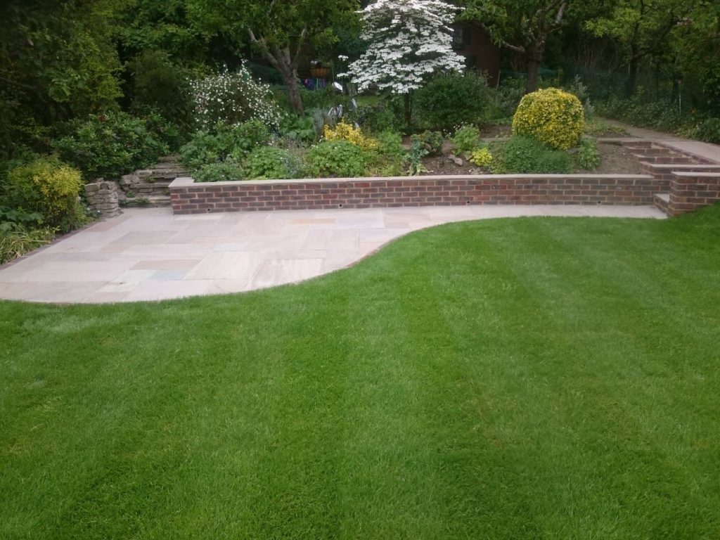 Work to be carried out would be a patio area in the rear garden at the end of the lawn by the existing rockery. A 9 inch wall at seat height was built and capped with Natural Stone paving. Steps were created where the right hand slope was.