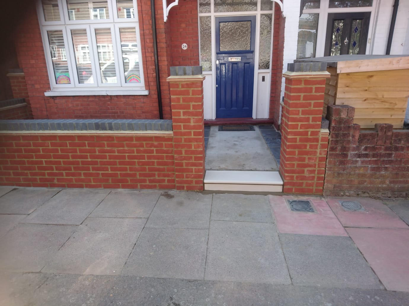 Between the front garden pillars and the concrete path we installed a limestone borneo step in order for the tiling to look neat once installed. Before the paving was laid we installed a new concrete screed path at 150mil deep ready to be tiled in the future by the customers.