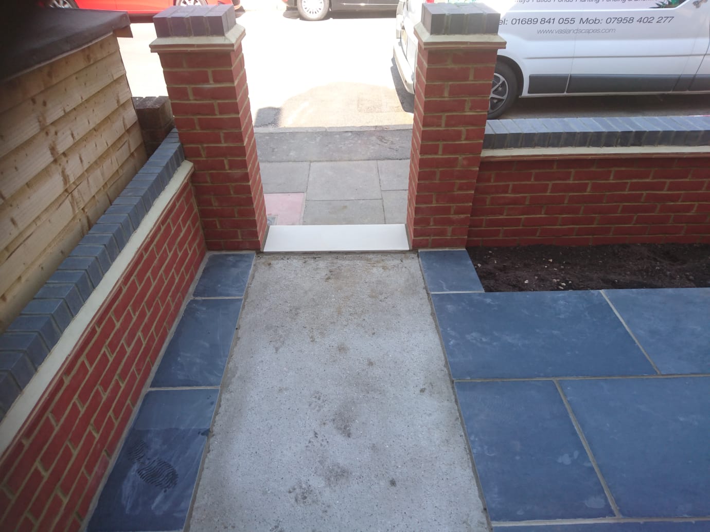Once the path was installed Vas Landscapes installed the blue slate paving and pointed it. The debris was then removed from the flower bed and we re dug the area and installed organic top soil.